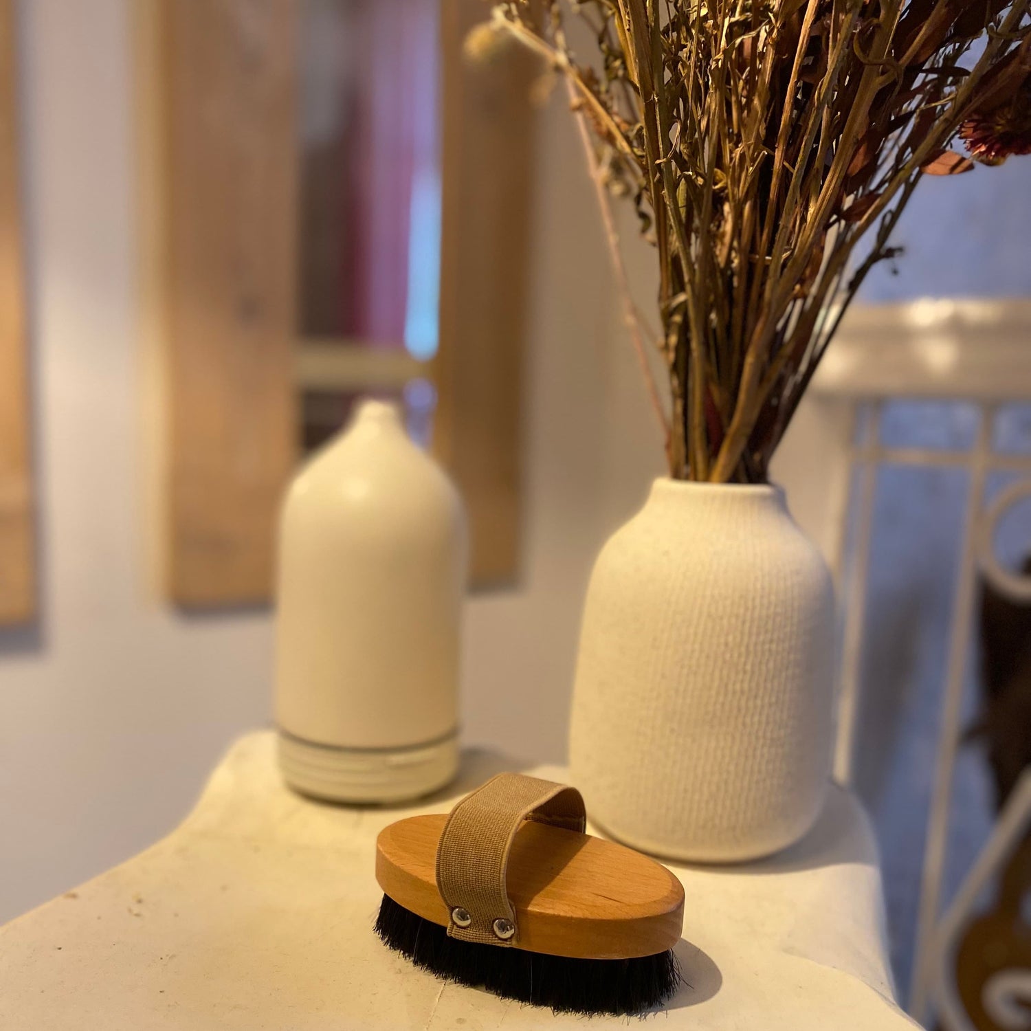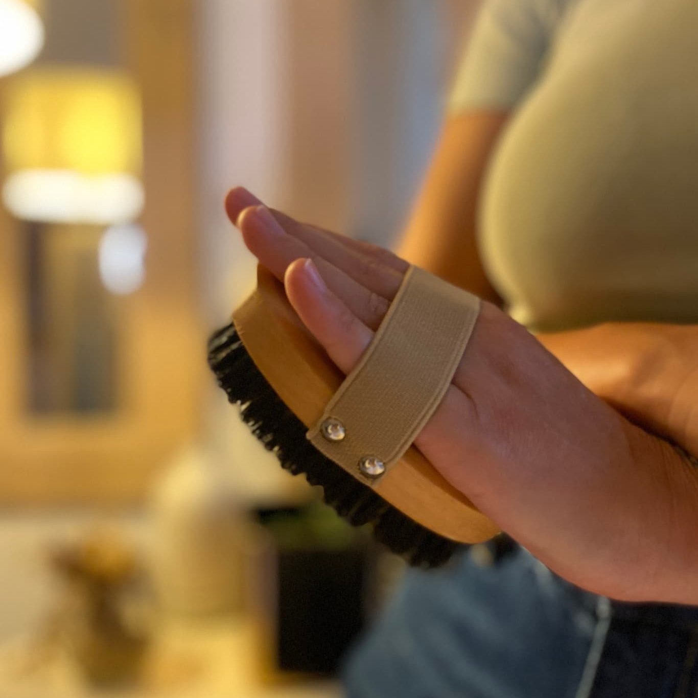 Prenez en main notre brosse à sec. Sa matière en bois de hêtre est aussi agréable au toucher que le sera votre peau.