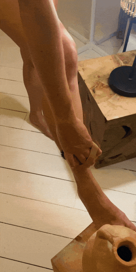 À pratiquer tous les jours avant de prendre sa douche. Sur les bras,le ventre, les jambes, les fesses. Faire des gestes de bas en haut ou circulaire pour le ventre. Comme montré sur le GIF.